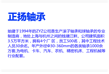 始建于1994年的ZYZ公司是生產(chǎn)滾子軸承和球軸承的專業(yè)制造商,地處上海與杭州之間的錢塘江畔。公司建筑面積3.5萬平方米,擁有4個廠?區(qū),員工500名,其中工程技術(shù)人員30余名。年產(chǎn)外徑Φ30-360mm的各類軸承1000余萬套,為電機、卡車、汽車、農(nóng)機、精密機床、工程機械等行業(yè)配套。